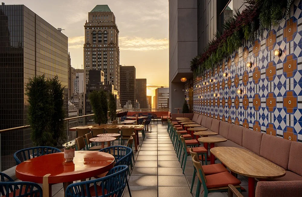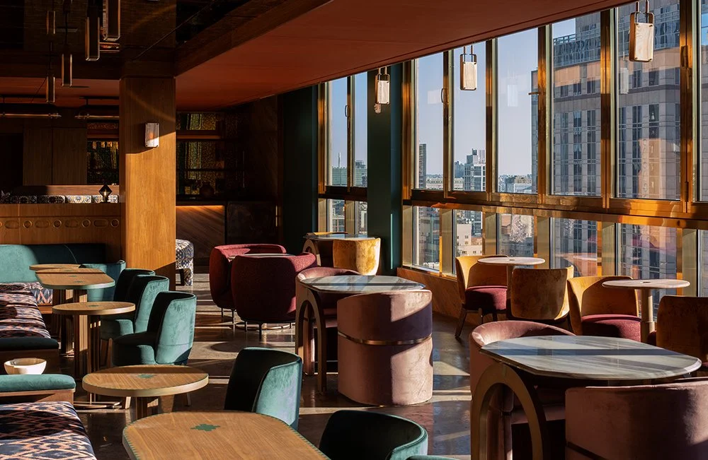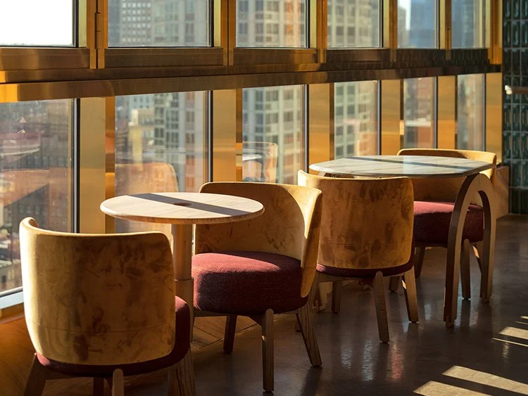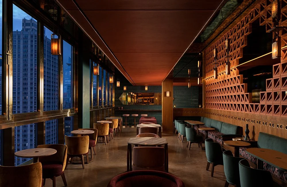The lounge has dramatic views of the Manhattan skyline, and both the Hudson and East Rivers are visible from the outdoor terrace. Custom alabaster lighting punctuate this jewel-tone rooftop gem, and a challengingly low ceiling is addressed using antique mirror.